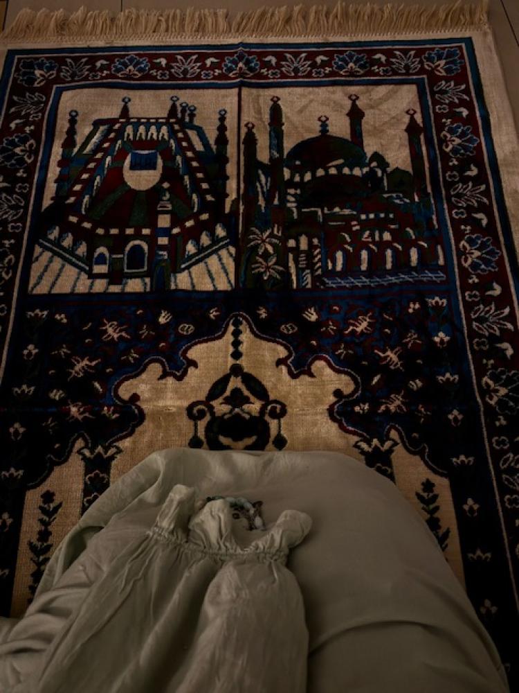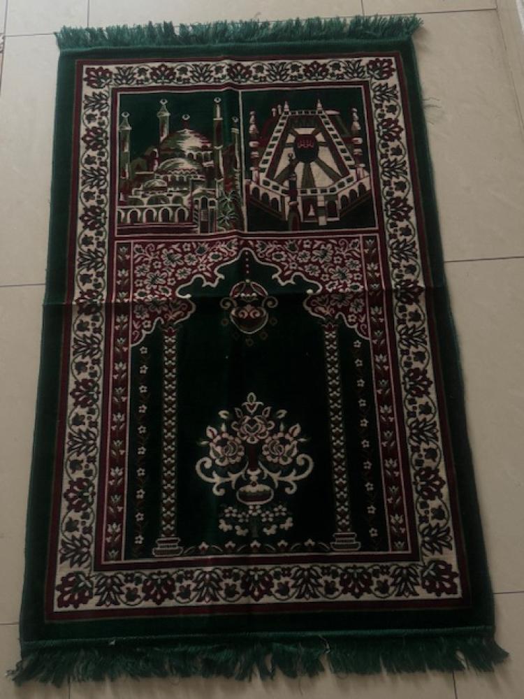 سجادة الصلاة ذات النقوش أسلامية قديمة ، تتميز بجمال تفاصيلها من حيث الألوان المتداخلة التي تنسجم مع بعضها بانسيابية فتضفي على السجادة جمالاً مختلف
